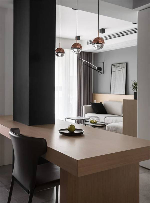 客厅设计以黑、白、灰的主色调为基础浅云白的墙面营造出通透感,灰色瓷砖地面搭配原木色饰面打破单调 ,赋予空间层次感。天花顶面装上筒灯,再明装导轨射灯配合灰色调软装布置呈现出一种极简大方的空间感。