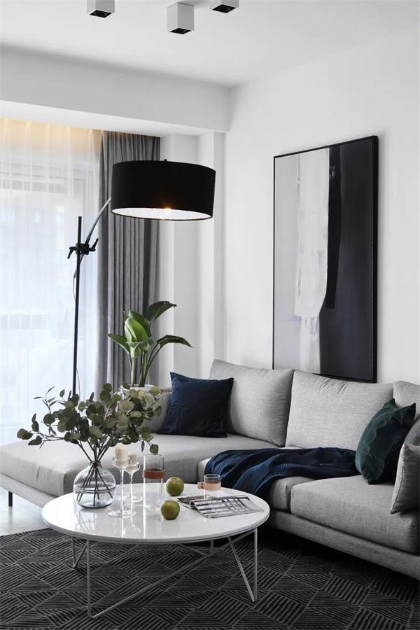 客厅空间巧妙运用了明亮的白色墙壁和原木色地板,赋予整个室内以宽敞和开放的感觉。家具选择了精妙的极简设计,包括低调的沙发,简约的咖啡桌和现代风格的装饰组合。