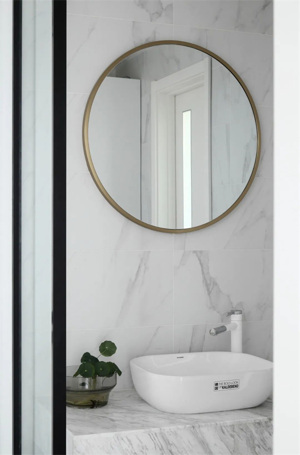 卫生间的洗手台设计简约,搭配定制储物柜,采用中性色调,为业主提供收纳空间的同时维持整洁。浴缸采用独立式设计,周围点缀着灰色瓷砖,强调了空间的纯粹与线条感,完美融合了日常实用性和美学价值。