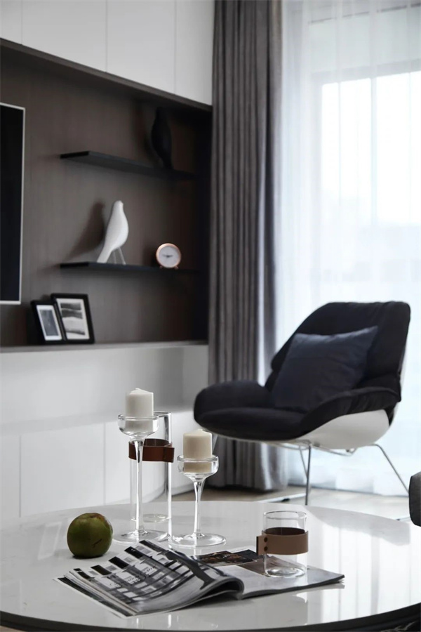 空间没有多余的装饰,注重简洁的线条和几何形状,打造了一个宁静而舒适的氛围。这个设计使得客厅成为一个理想的休憩场所,突显了空间的纯粹美感。