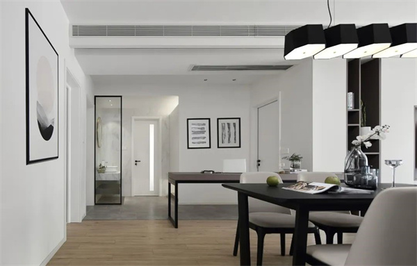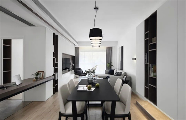 餐厅延续了极简风格,以简约的餐桌和现代餐椅为特色,白色墙壁和深色的定制柜创造了一个纯净的用餐环境。餐厅顶面的一排吊灯提供适当的亮度,并增添温馨氛围,不仅适合家庭用餐与客人的聚会,更使用餐成为一种愉悦的体验。