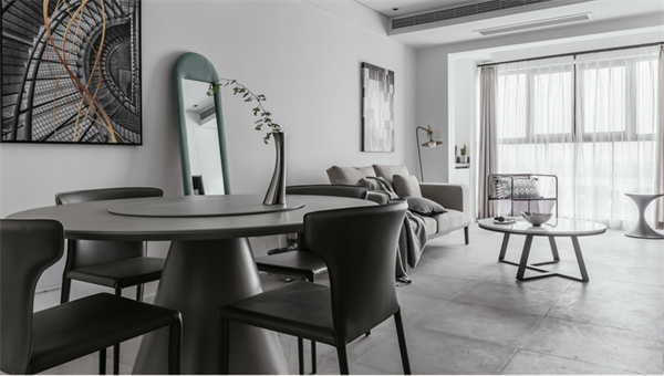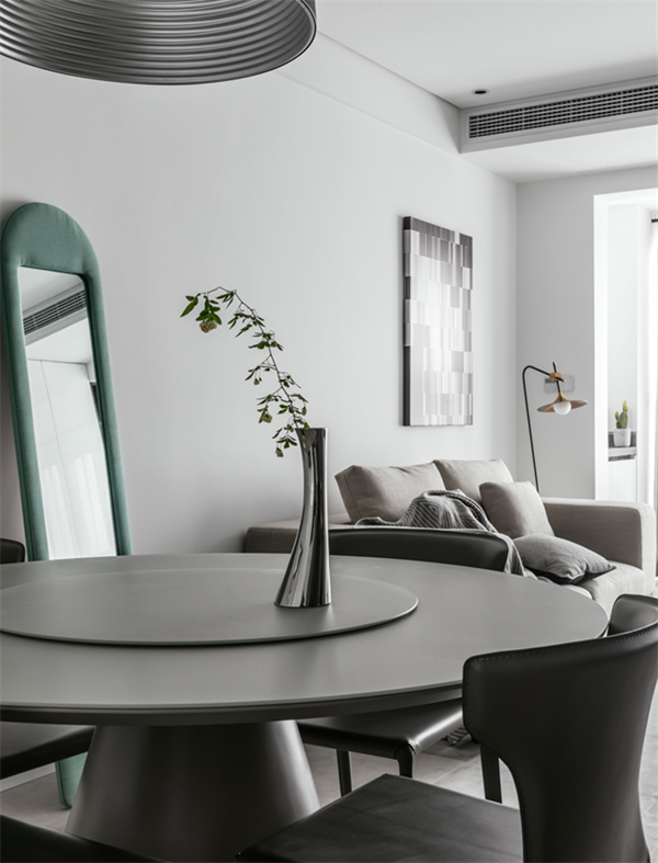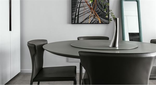 餐厅采用深色餐桌和现代风格的椅子,灰色皮艺餐椅为用餐区增添舒适感。顶部悬挂着精致的吊灯,提供柔和的照明,配和墙面装饰艺术作品,为空间增添了一抹现代感。