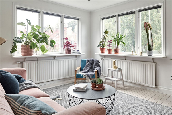 客厅白色的墙面与自然木色的家具相映衬,打造出明亮宽敞的空间。一组粉色布艺沙发与柔软的地毯搭配,营造出舒适宜人的氛围。