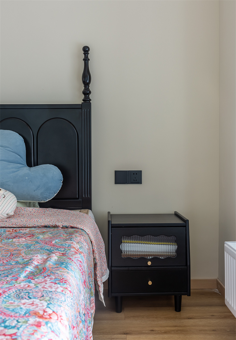 主卧延续了整体的色系搭配法则。大面积奶油色调让整个空间看起来复古又慵懒。背景墙搭配了款式简约的石膏线条,恰到好处地增添了精致感。黑色木质床架与色彩丰富的床上用品搭配,既经典又不失活力,让人感受到法式风情的独特魅力。