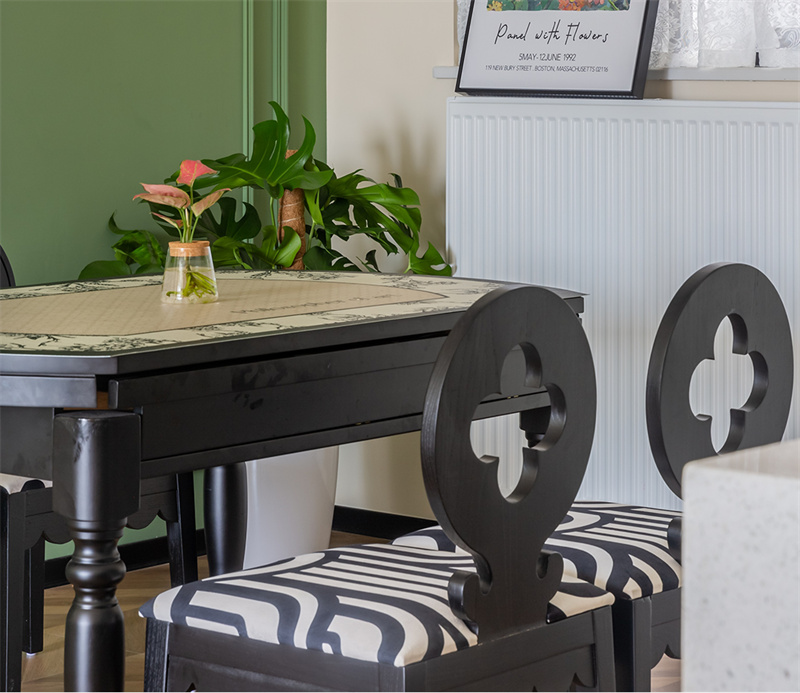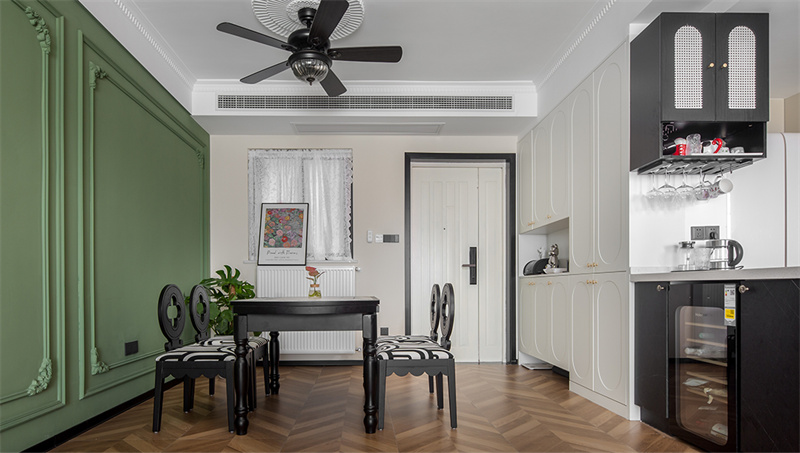 餐厅定制了整排收纳柜,承担了收纳+餐边柜功能。原木餐桌搭配复古吊灯,营造出自然温馨的就餐环境。背景墙整面做绿色装饰,与白墙和黑色的餐桌椅组合,彰显出自由、灵动的美学意蕴。