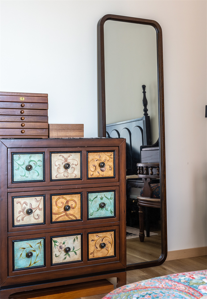 床头一角的实木梳妆台形如小钢琴轻盈灵动,静置角落装点卧室,每一处细节都充满法式的浪漫与优雅。