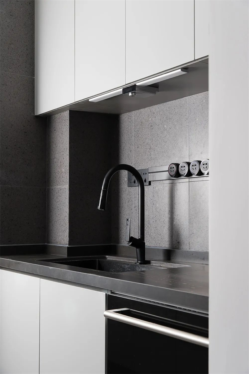 厨房是一个完美的结合了功能性和美学的空间。清洁的线条和简约的设计元素在这里主导,灰色的定制橱柜提供了充足的储存空间,同时保持了整个空间的干净度。智能灯光和智能厨房电器的使用,提高了生活的便利性,为业主打造一个理想的烹饪空间。