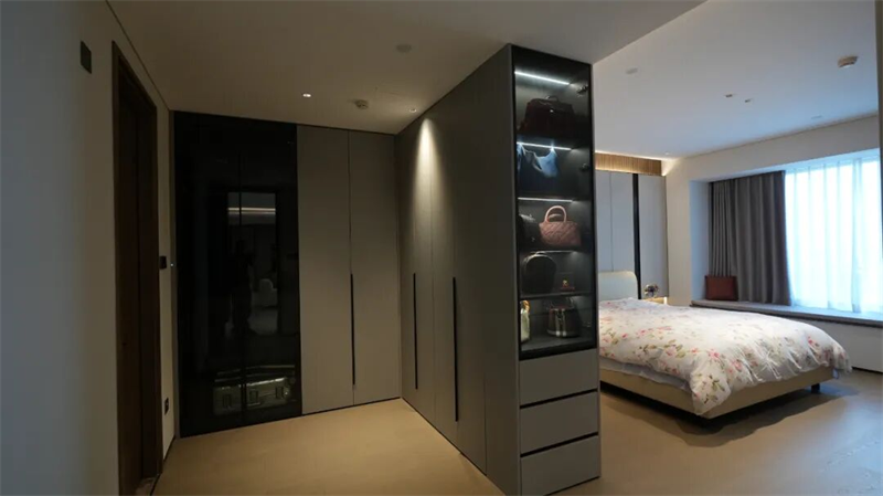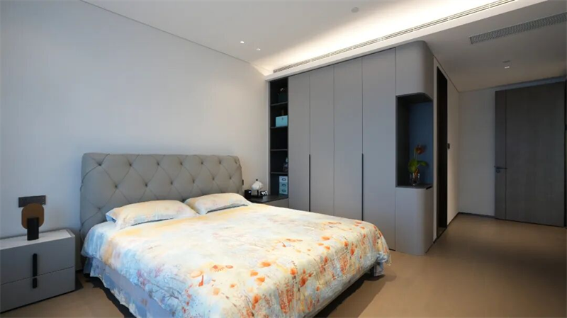 主卧整体色调沉稳柔和,灰色软包背景墙搭配木饰线条与隐藏式灯带,营造出静谧而高级的睡眠氛围。米色皮质大床配花卉图案床品,增添一抹自然柔美,让空间更具温度。一侧开放式衣柜与嵌入式收纳结合,满足衣物与饰品的分类存放需求,兼顾美观与实用性,打造一个整洁有序的私密空间。