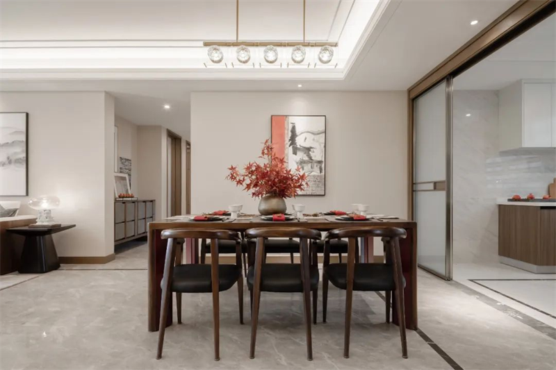 餐厅的餐桌椅采用原木材质,融合传统工艺与简约线条,独具匠心。餐桌上摆放着精致的餐具和红枫盆栽,墙面悬挂着一幅传统水墨风画作,充满东方韵味和现代雅致的装饰细节,让空间散发着独特的魅力。