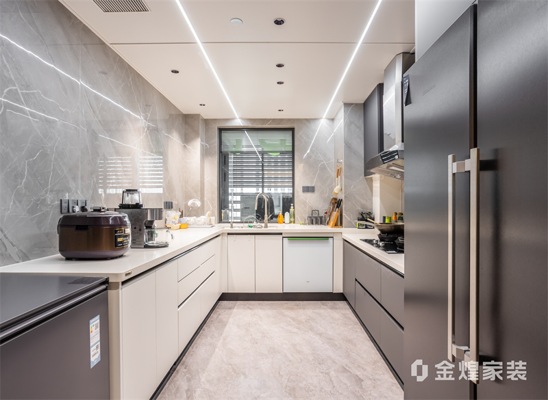 该设计以无主灯设计、岩板与木作结合,打造通透大气的现代轻奢大平层,兼具质感与生活温度。